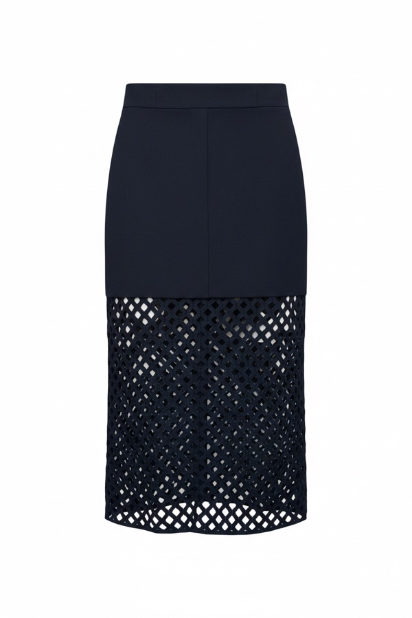 深蓝色拼接镂空中长半身裙